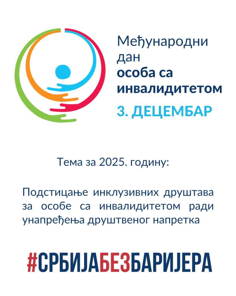 Међународни дан особа са инвалидитетом – 3. децембар, проглашен од стране УН-а 1992. године од када се обележава у целом свету, прилика је да се скрене пажња светске и домаће јавности на једну од највећих маргинализованих група – особе са инвалидитетом (према подацима Светске здравствене организације између 12% и 15% становништа има неку врсту инвалидности) и на бројне проблеме са којима се она суочава због неједнаких друштвених могућности.